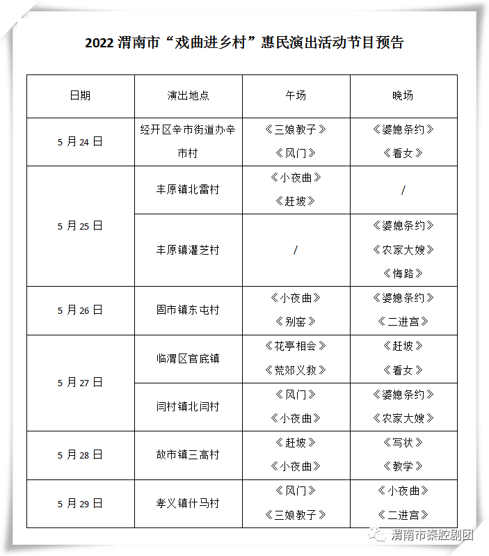 建功新時代,喜迎二十大,為弘揚社會主義核心價值觀,將中華民族優秀傳統文化根植于居民精神文化生活,轉化成人民的情感認同和行為習慣,即日起,由中共渭南市委宣傳部、渭南市文化和旅游局主辦、渭南市秦腔劇團有限責任公司演出的“2022 渭南市‘戲曲進鄉村’惠民演出活動”正式開啟。我們將為廣大鄉村群眾戲迷朋友送來豐富的文化大餐讓村民在家門口就可以了解、熱愛和傳承秦腔傳統文化,不斷豐富渭南人民的精神文化生活。請各位村民和戲迷朋友們提前關注預告,前來觀看。