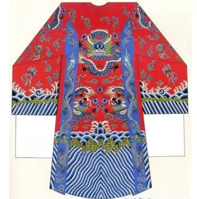 蟒袍:在戲中是帝王將相的官服。樣子是圓領,大襟帶水袖,質料用緞子,手工繡花,圖案是團龍或虎,下擺繡海水、江涯。