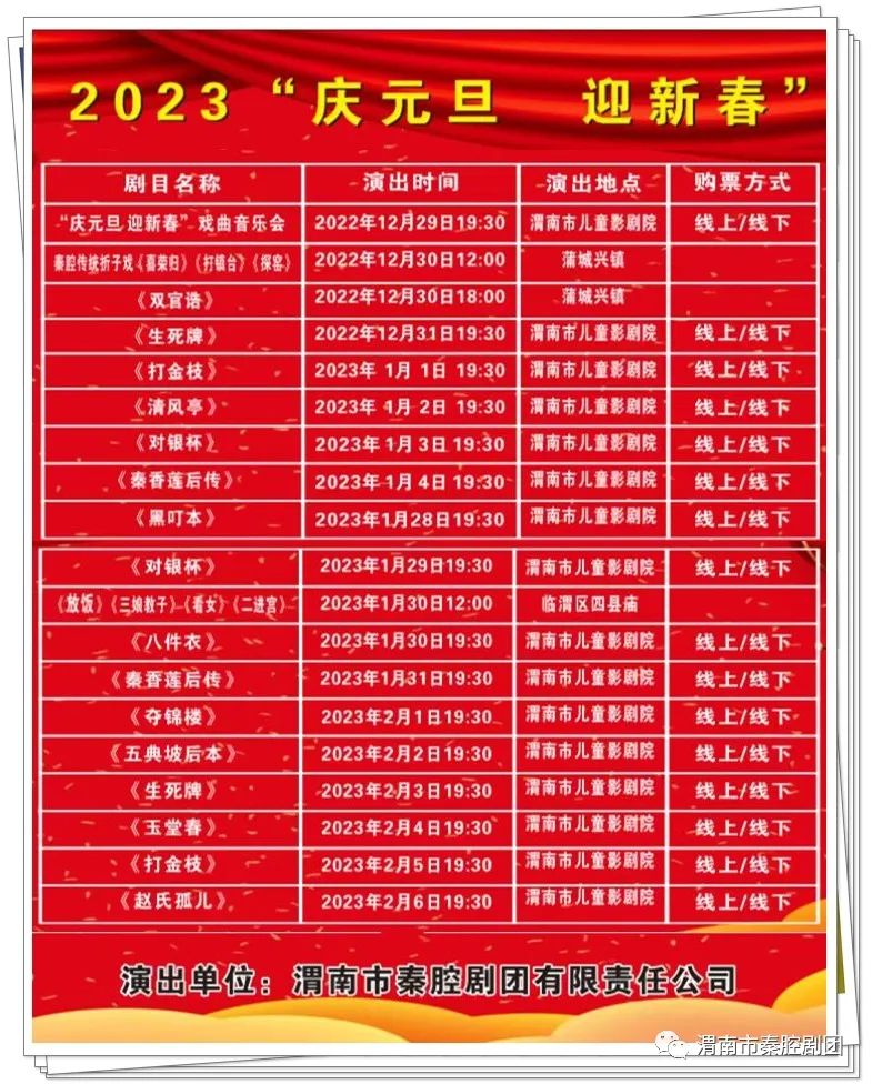 大雪已過,歲末將至。2023年的鐘聲即將敲響。為豐富節(jié)日期間廣大群眾的精神文化生活,弘揚(yáng)地方戲曲藝術(shù),營造歡樂、喜慶的節(jié)日氛圍,渭南市秦腔劇團(tuán)特推出2023“慶元旦 迎新春”優(yōu)秀劇目演出季,為廣大市民朋友送上豐盛的戲曲大餐!